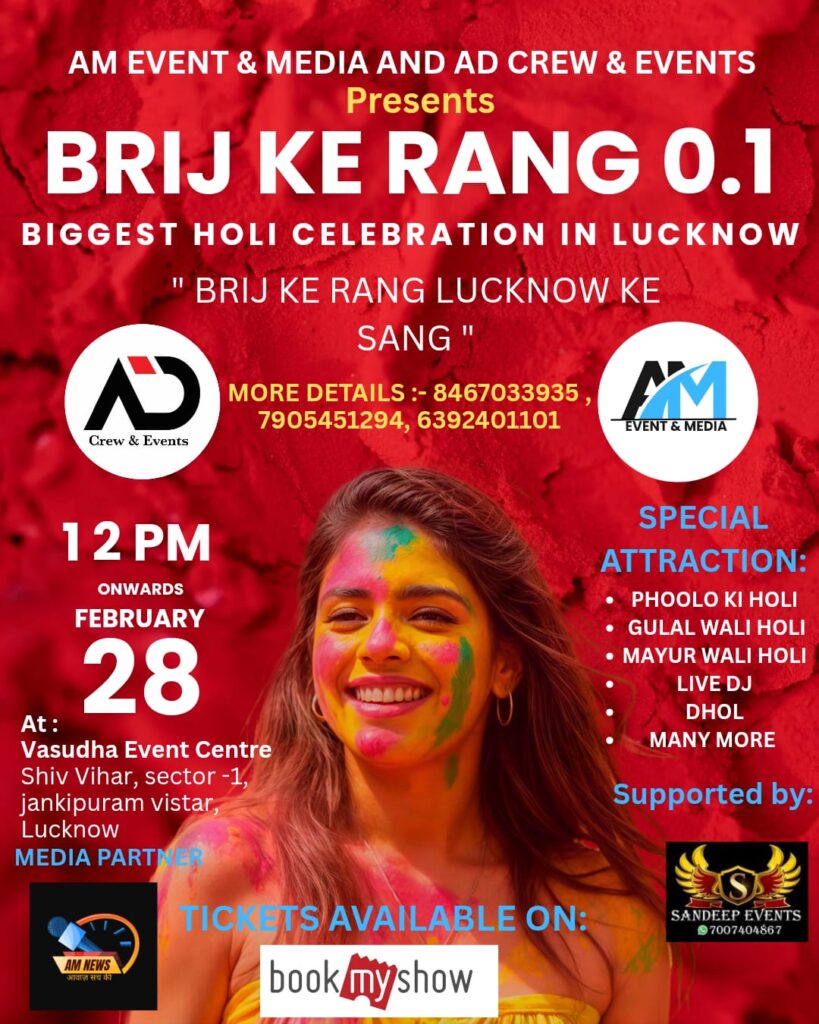 Brij Ke Rang 0.1 is one of the biggest Holi celebrations in Lucknow, organized by AM Event & Media and AD Crew & Events. This grand festival brings together colors, music, entertainment, and unlimited fun under one roof.